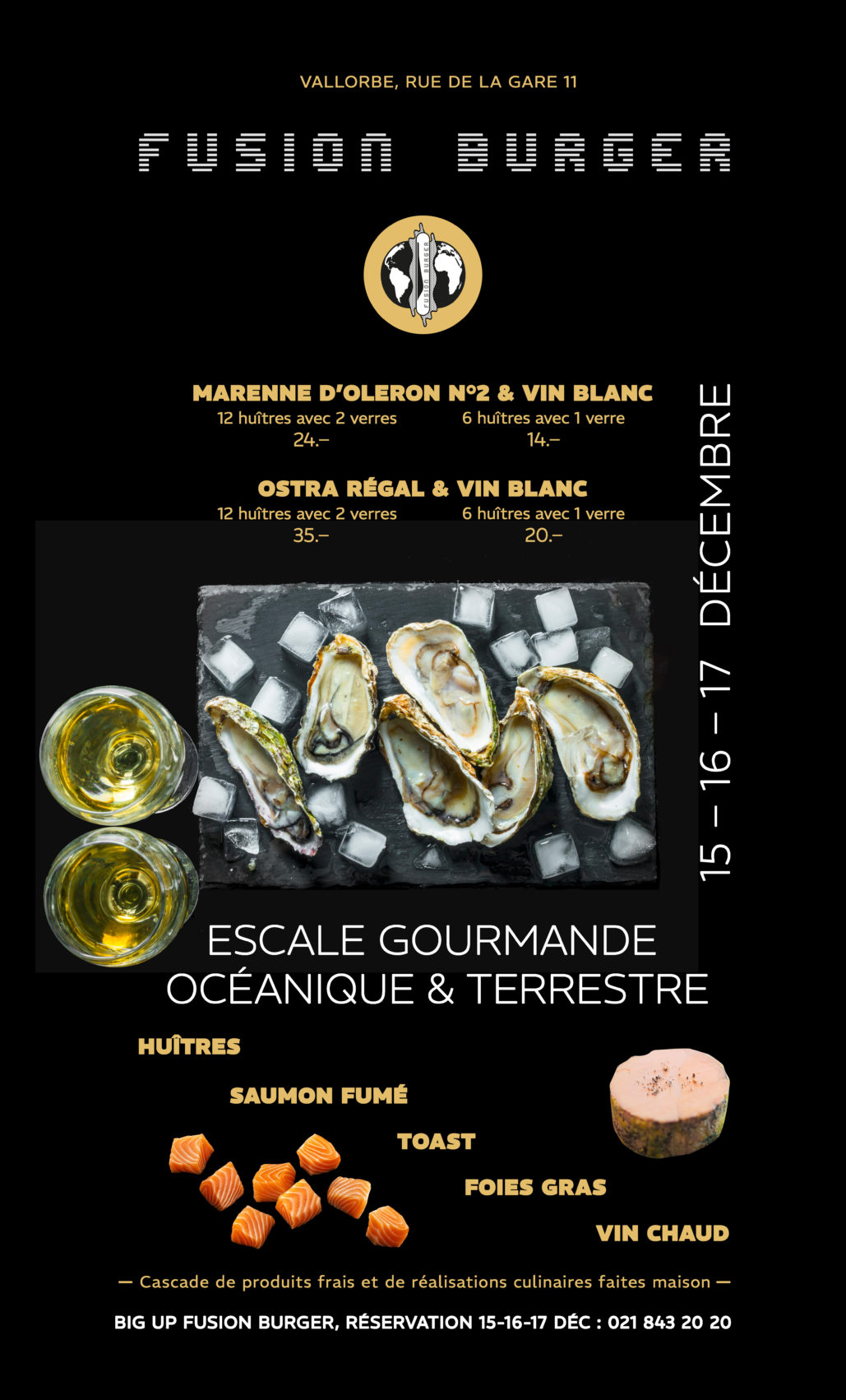 Nous avons le plaisir de vous accueillir les 15,16,17 décembre de 12h à 14h et de 18h a 22h pour déguster :